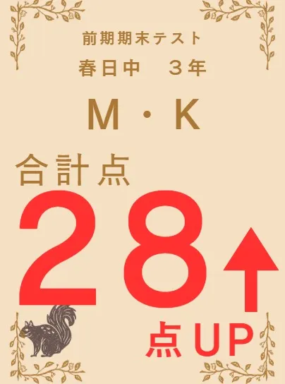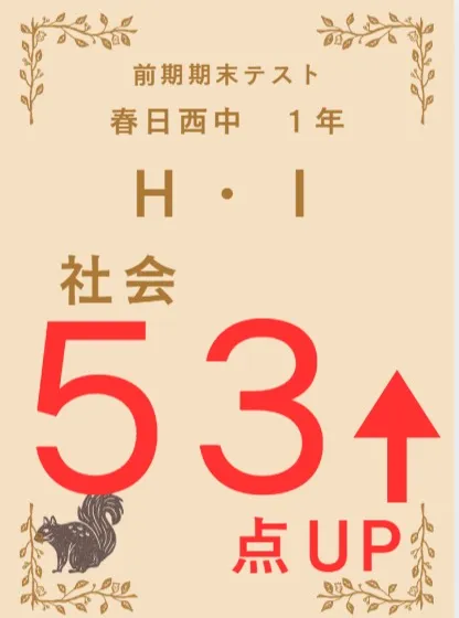 前期期末テスト成績アップ者紹介⑨夏休みに夏期講習を受講し、そのまま入塾を決めてくれたIくん。その夏期講習は社会を受けましたが、なんと53点も上がりました!西中1年の前期中間テストが異常なほど難し…